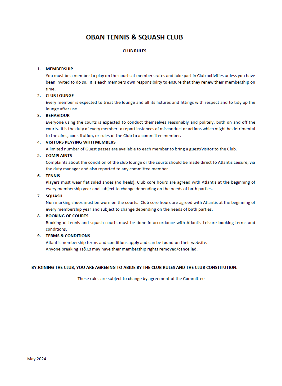 Oban Tennis & Squash Club offer a combined membership which includes the following benefits: